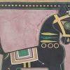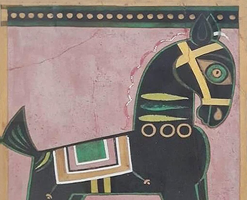 This striking painting by Jamini Roy represents one of his most iconic subjects—the Bankura Horse, a motif deeply rooted in Bengali folk tradition. Executed in tempera on paper board, the work exemplifies Roy’s mastery in transforming rural craft aesthetics into modernist art. The horse, painted in bold black with geometric contours, is adorned with stylized harness patterns in green, yellow, and white, set against a muted pink background. The rhythmic symmetry of its form and the decorative border framing the composition reflect the influence of patachitra, while the subject itself recalls the terracotta horses of Bankura, long revered as symbols of ritual offering and cultural identity. Roy’s treatment strips away realism, instead presenting a purified, timeless image that bridges folk artistry with modern sensibilities.