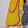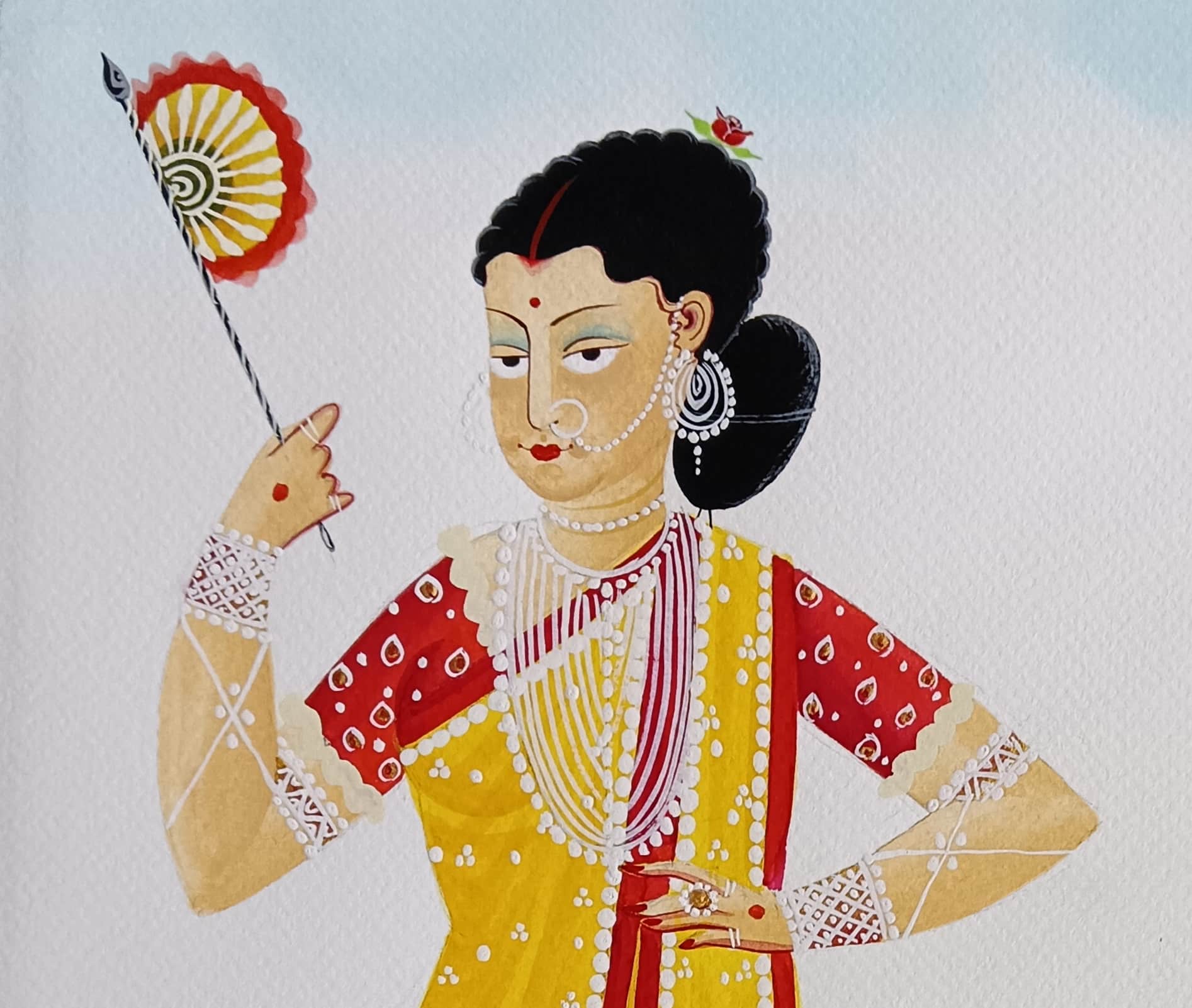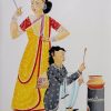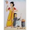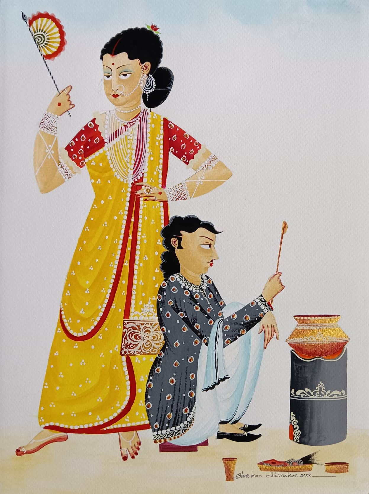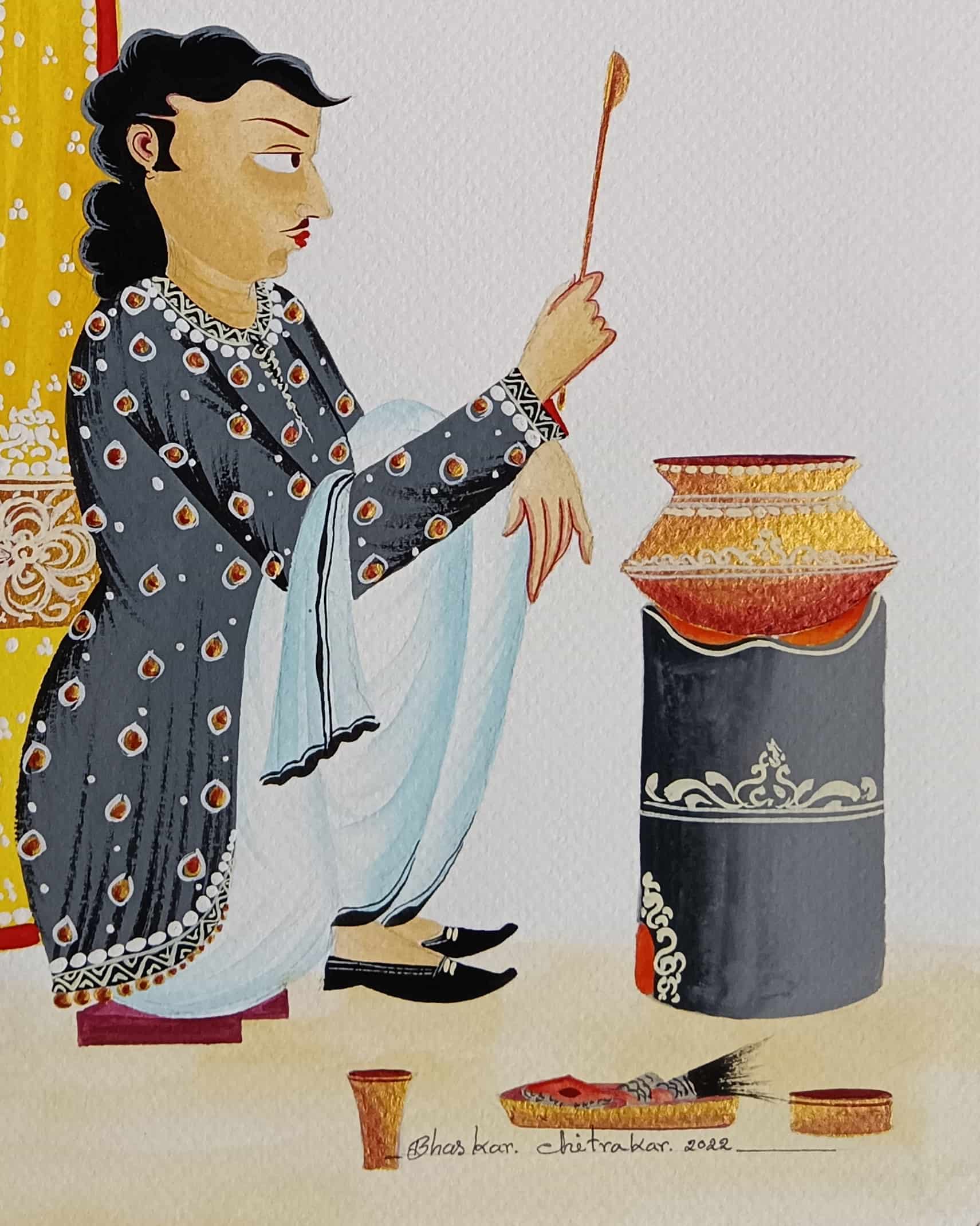 This charming watercolor painting by Bhaskar Chitrakar beautifully captures a moment from traditional Indian domestic life with a whimsical twist. A woman, dressed in a bright yellow sari adorned with white and red patterns, stands gracefully holding a decorative fan, exuding elegance and quiet authority. Beside her, a man is seated, focused intently as he stirs a pot with a ladle, likely preparing food. His dark blue attire is richly patterned, matching the ornate detailing on the pot and surroundings. The contrast between their postures — the woman upright and poised, the man engaged in domestic labor — adds subtle humor and commentary on gender roles. Chitrakar’s use of miniature painting techniques and his unique storytelling infuse the scene with both nostalgia and satire, making it a delightful narrative full of cultural textures.
