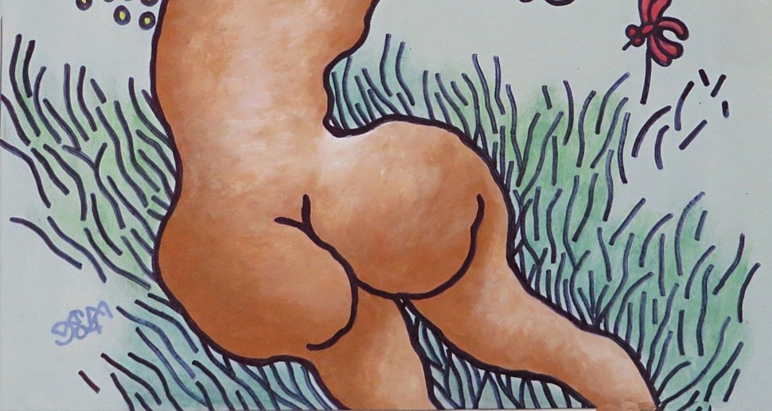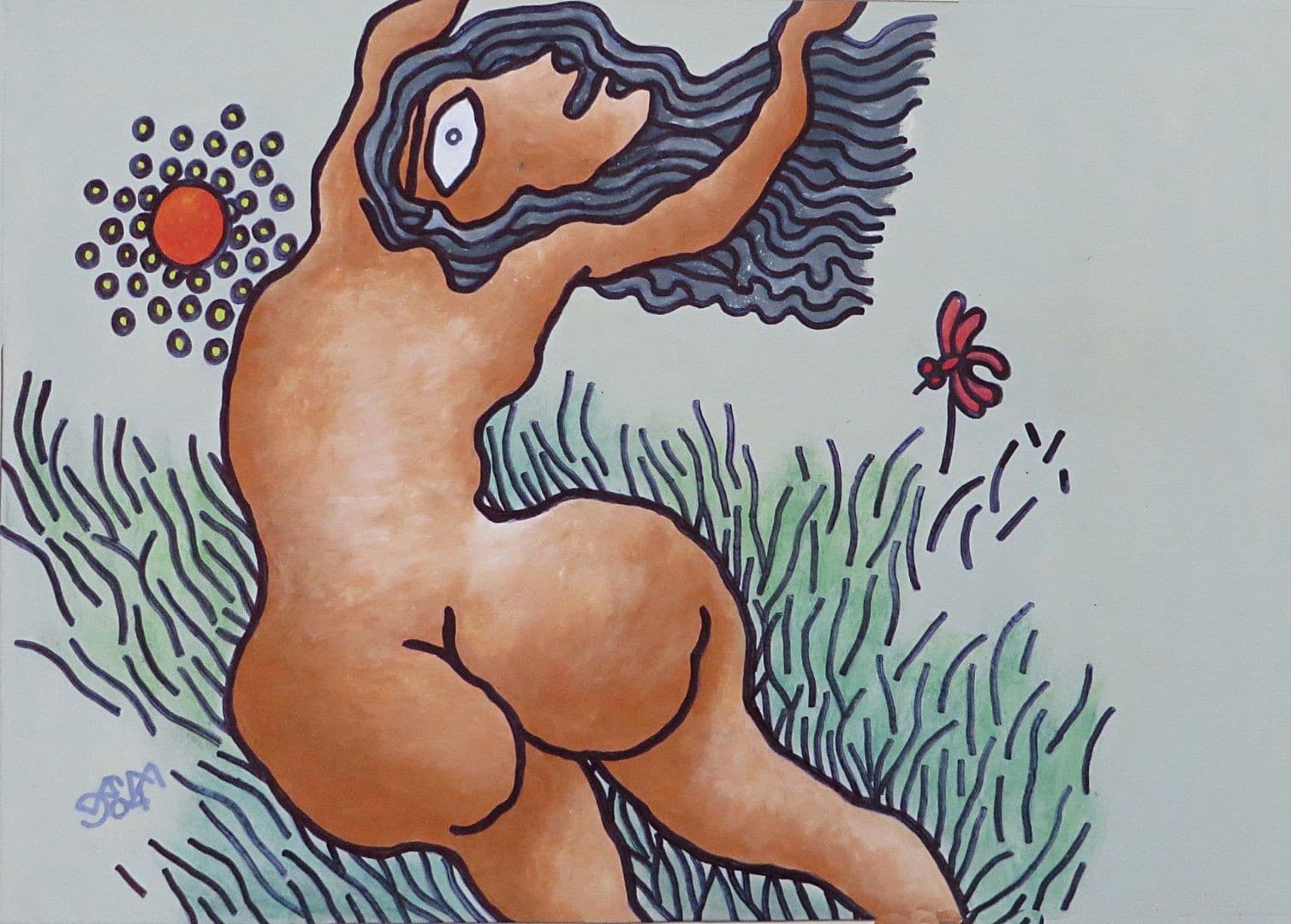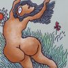 This vibrant and sensuous work by Prokash Karmakar, titled Lady, The Sun & The Butterfly (2004), celebrates the joy of freedom and the raw beauty of nature. Executed in mixed media, the painting features a nude female figure in a dynamic pose, her flowing hair and arched back exuding a sense of liberation and uninhibited energy. The surrounding elements—a radiant sun rendered in bold dots and a delicate red butterfly—serve as symbolic contrasts of power and fragility, vitality and grace. Karmakar’s signature use of bold outlines, exaggerated forms, and playful yet primal imagery creates a composition that feels both earthy and dreamlike, embodying his fascination with nature and the female form.