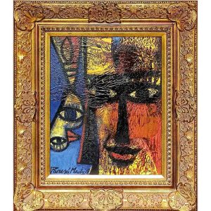 Jamini Roy’s painting beautifully captures a scene steeped in Indian mythology and rural life, On the left, Lord Ram appears alongside his sons, Luv and Kush, capturing a familial moment of deep spiritual and emotional resonance. At the heart of the painting are two resting deer, their serene presence embodying nature’s harmony, further enhance the narrative’s pastoral tranquility. To the right of the hut, The solitary woman—likely Sita sits alone, her figure stylized with bold contours and simplified forms. Roy’s use of earthy tones, including muted yellows, and browns, abstract flower motif creates a serene yet evocative atmosphere, reinforcing the deep ties between mythology and rural tradition. The bold contours and flat color application align with his rejection of Western academic realism, embracing indigenous aesthetics. The themes of devotion, familial bonds, and spiritual reflection resonate deeply, making this work historically significant in the evolution of Indian modern art. Roy’s approach continues to inspire generations, ensuring folk aesthetics remain integral to contemporary artistic discourse. His ability to merge mythology with abstraction elevates the painting’s cultural and artistic impact.