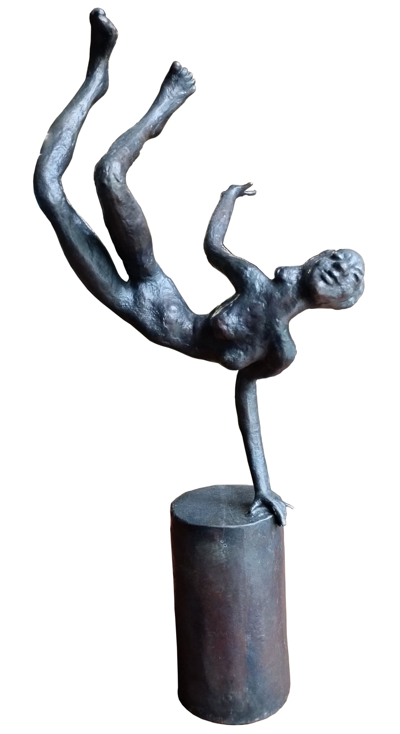 This sculpture is a bronze artwork by K.S. Radhakrishnan, titled “Maiya.” It is a dynamic and graceful representation of a female figure poised in an acrobatic, almost balletic position, balanced effortlessly on one hand. The figure, nude and free-spirited, conveys a sense of motion, balance, and expressive joy — hallmarks of Radhakrishnan’s celebrated “Maiya” series. His works often explore the human form in fluid movement, merging traditional sculptural technique with a contemporary sense of vitality and freedom.