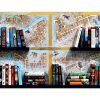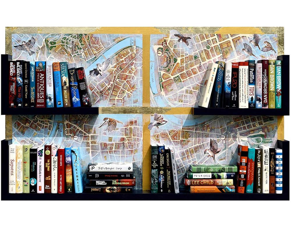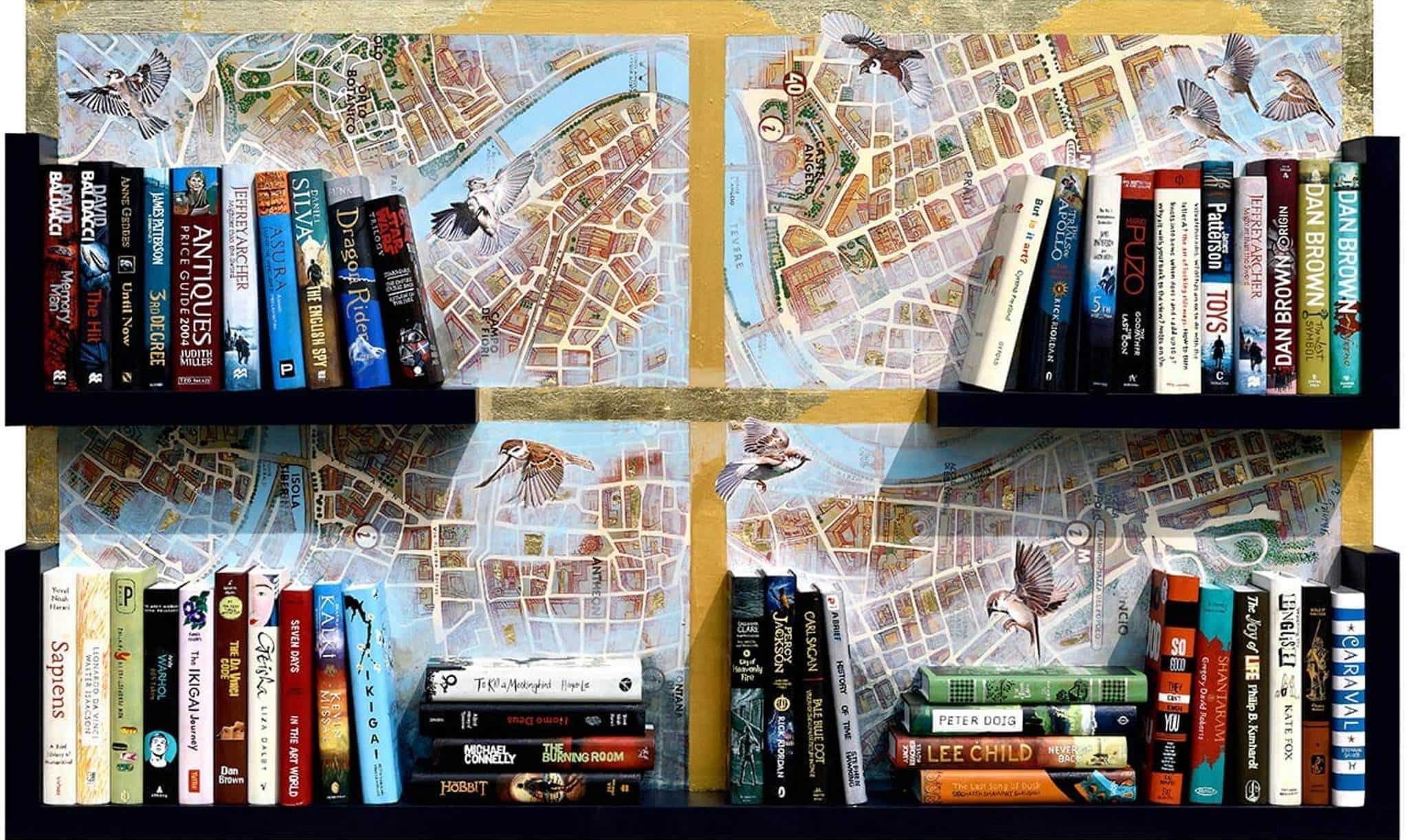 This artwork, titled “Reactivating: The Golden Era” by Arunanshu Chowdhury, is a striking blend of painting and installation that merges literature, urban mapping, and avian symbolism into one cohesive visual experience. Created using acrylic and mixed media on canvas and wood, the piece depicts a set of bookshelves filled with real or painted books, each spine meticulously detailed to evoke the tactile richness of a personal library.