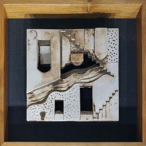 This artwork, titled “Reactivating: The Golden Era” by Arunanshu Chowdhury, is a striking blend of painting and installation that merges literature, urban mapping, and avian symbolism into one cohesive visual experience. Created using acrylic and mixed media on canvas and wood, the piece depicts a set of bookshelves filled with real or painted books, each spine meticulously detailed to evoke the tactile richness of a personal library. Behind the shelves lies a beautifully rendered map-like background, overlaid with delicate birds in flight, symbolizing freedom, knowledge, and exploration. The golden cross-structure running through the background adds a divine or timeless quality—perhaps alluding to enlightenment through art and literature. The juxtaposition of books and maps suggests the journey of the mind and spirit, where stories become pathways and reading transforms into a voyage. Chowdhury’s composition celebrates nostalgia and the enduring power of books in a digital age, reawakening the golden era of intellectual curiosity and creative adventure.