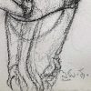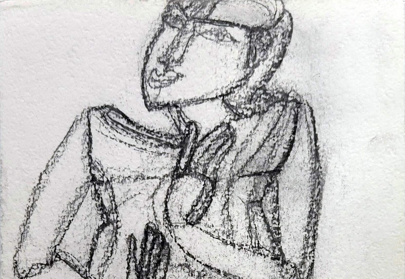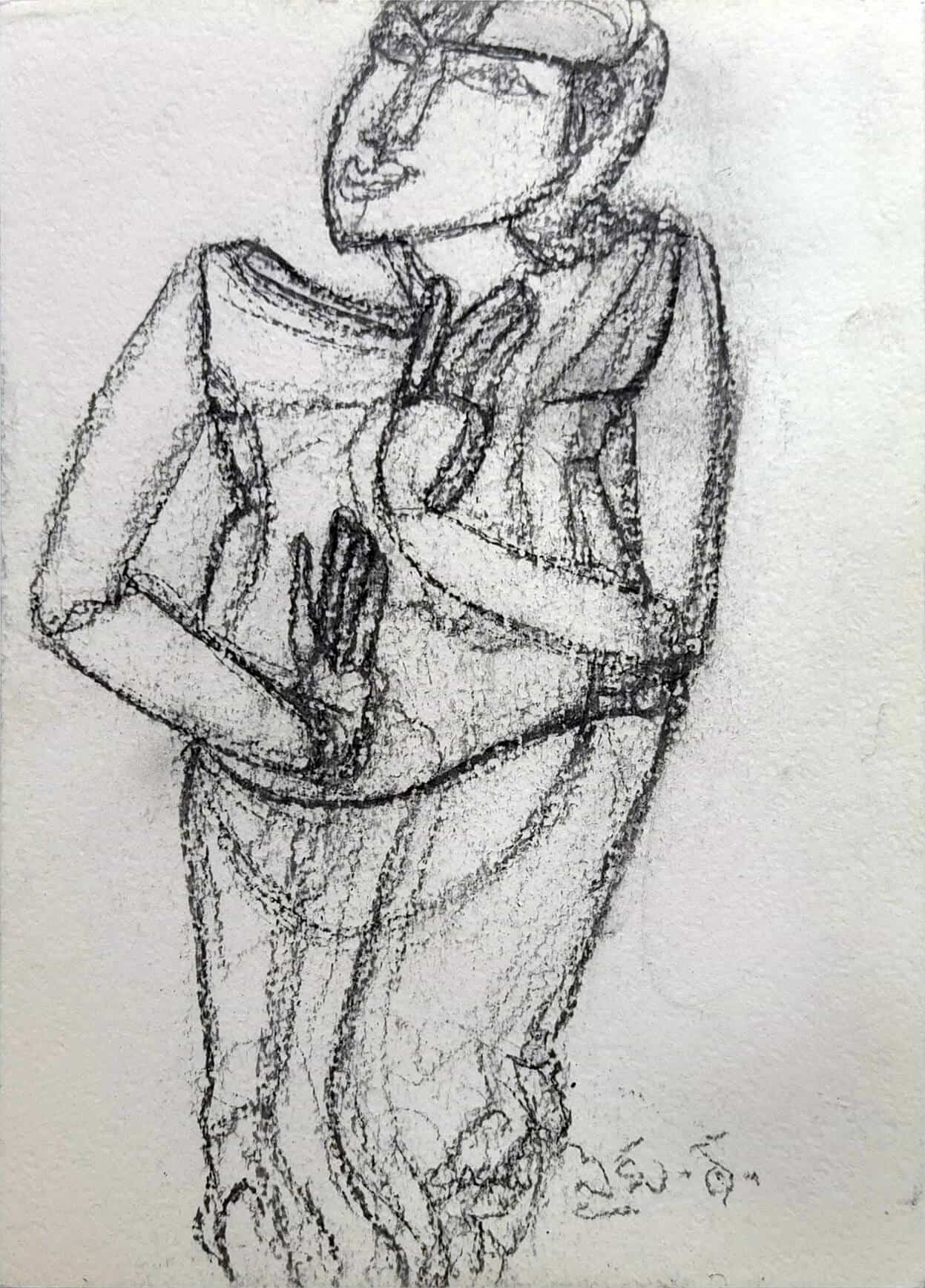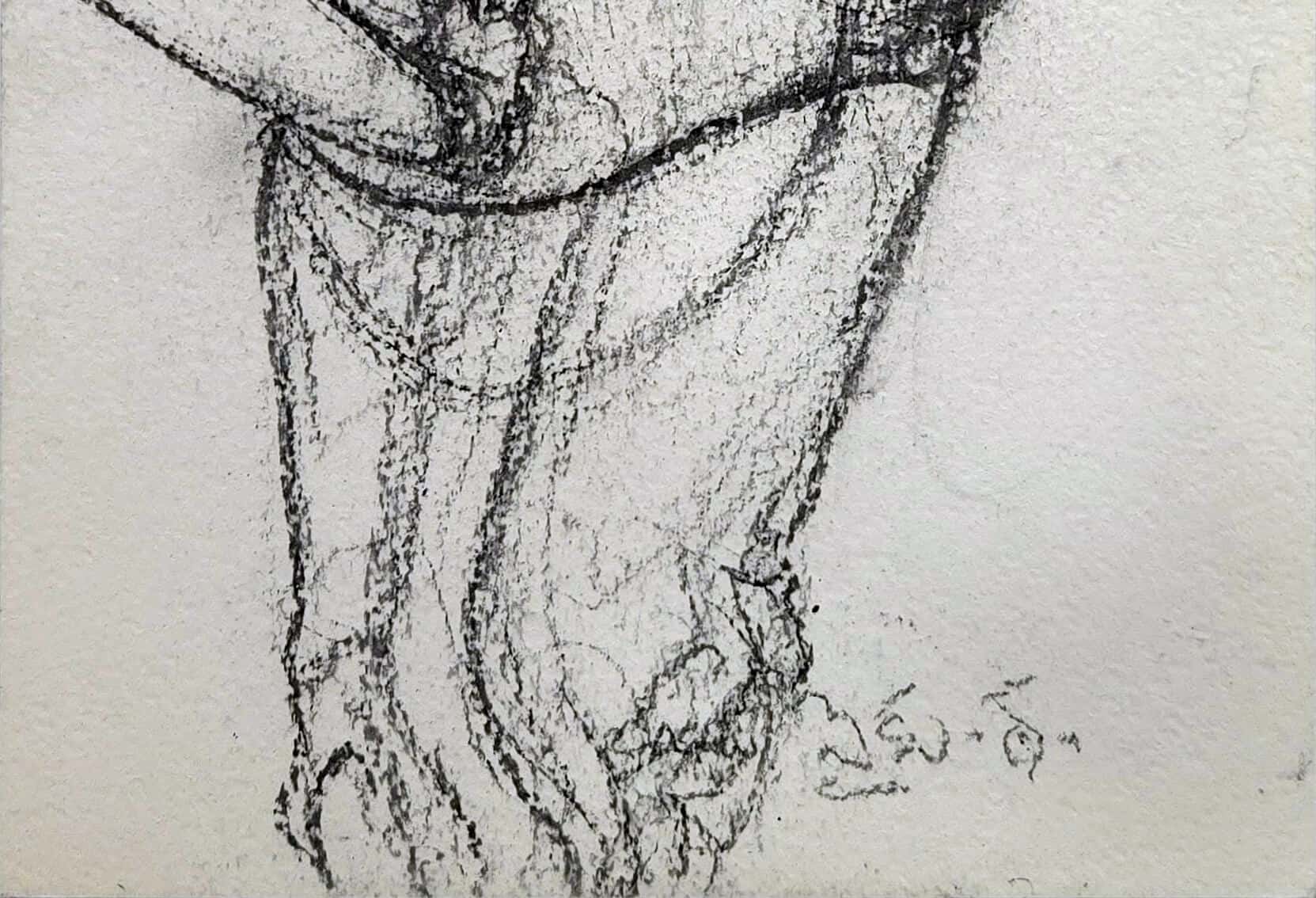 This charcoal on paper drawing by Thota Vaikuntam, created in 2014, portrays a Telangana pandit in the artist’s distinctive style. The figure is rendered with bold, linear strokes that emphasize both form and gesture rather than intricate detail. The subject, draped in traditional attire, is shown in a humble, almost meditative pose, with hands positioned near the chest, exuding a sense of spirituality and calm. Vaikuntam’s ability to capture the essence of rural life and cultural identity shines through in this work, where the simplicity of line and the raw texture of charcoal give the figure an expressive depth. The sketch reflects his lifelong dedication to immortalizing the people and traditions of Telangana, making even the most minimal strokes resonate with character and cultural rootedness.