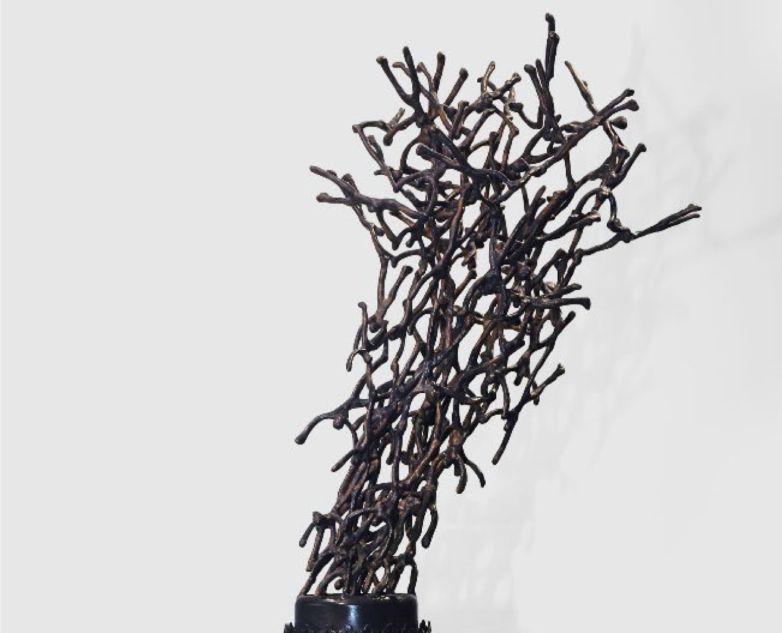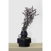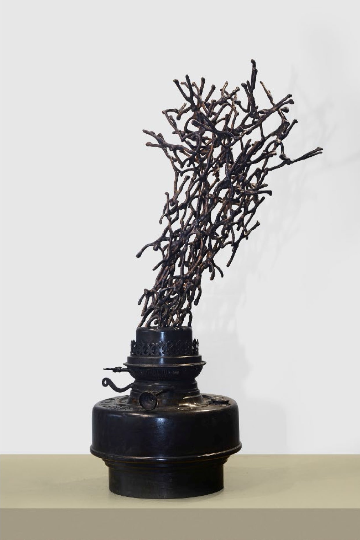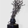 This artwork, “Tune of the Flame” (2017) by renowned sculptor K.S. Radhakrishnan, is a striking bronze creation. The sculpture reimagines the form of an old oil lamp, from which an intricate network of branch-like figures emerges, evoking the visual rhythm of a dancing flame. Radhakrishnan’s work often blends human and organic forms, and here, the intertwining shapes seem to capture both motion and energy—symbolizing transformation, vitality, and the ephemeral nature of light. The dark bronze finish enhances its timeless presence, making it both a contemplative and visually dynamic piece.