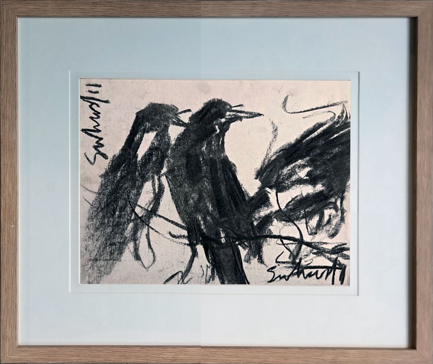 This artwork, created by Suhas Roy in 2011, is a striking charcoal on paper composition that captures the raw, expressive beauty of a bird in motion. With bold, sweeping strokes and smudged textures, the piece conveys a sense of vitality and freedom, while the stark black forms stand out against the light background. Roy’s gestural approach transforms the bird into a near-abstract form, evoking both the elegance and wild energy of nature. The minimal detailing allows the viewer’s imagination to fill in the gaps, making it as much about emotion and atmosphere as about the subject itself.