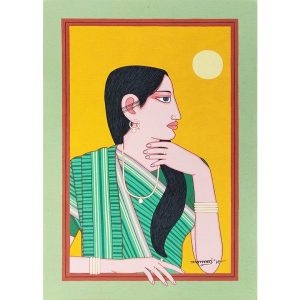 This artwork is a graceful line drawing that reflects simplicity and elegance, characteristic of traditional Indian art. The figure depicted is divine, holding a lotus in one hand and a weapon in the other, symbolizing both beauty and power. The presence of the cow beside the figure adds a sacred dimension, evoking associations with purity, nourishment, and spirituality. Executed with fluid, confident strokes, the drawing captures the essence of Indian aesthetics, where minimal lines convey profound depth and expression. The posture, ornaments, and serene expression suggest a connection to mythology and devotion, making the piece timeless in its cultural significance.