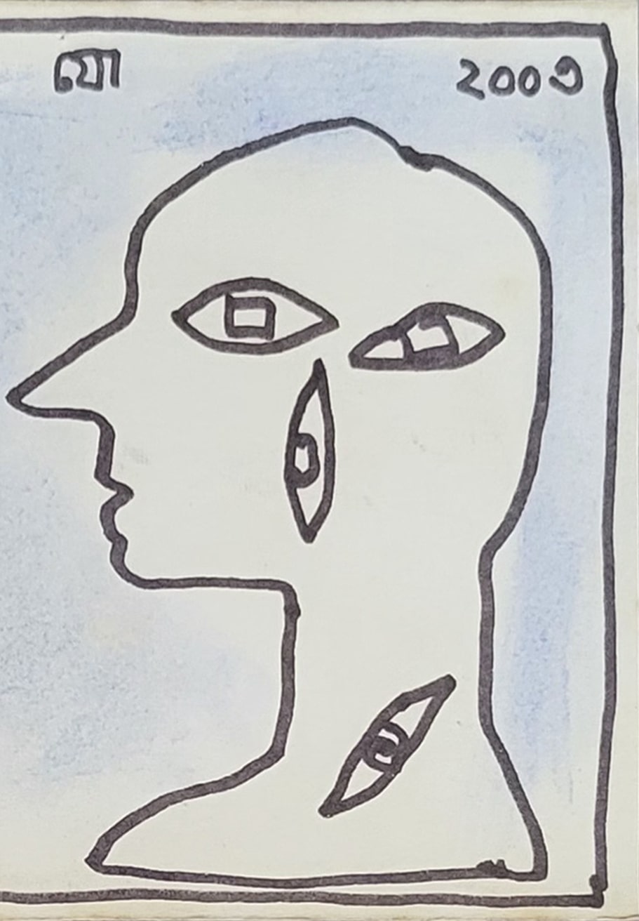 This intriguing artwork by Jogen Chowdhury, dated 2003, is a compelling example of his distinct visual language that blends surrealism with psychological depth. Created using ink and pastel on paper, the piece features two stylized human heads rendered in minimalist outlines against a pale blue wash. What immediately stands out are the multiple eye-like motifs embedded across their faces and bodies—suggesting heightened perception, inner vision, or emotional fragmentation. The distorted forms and asymmetrical features evoke a sense of tension and introspection. Chowdhury, known for exploring the human condition and subconscious through semi-abstract forms, seems here to question identity, perception, and the multiplicity of self. The mirror-like juxtaposition of the two figures also hints at duality—perhaps of thought, persona, or perspective.