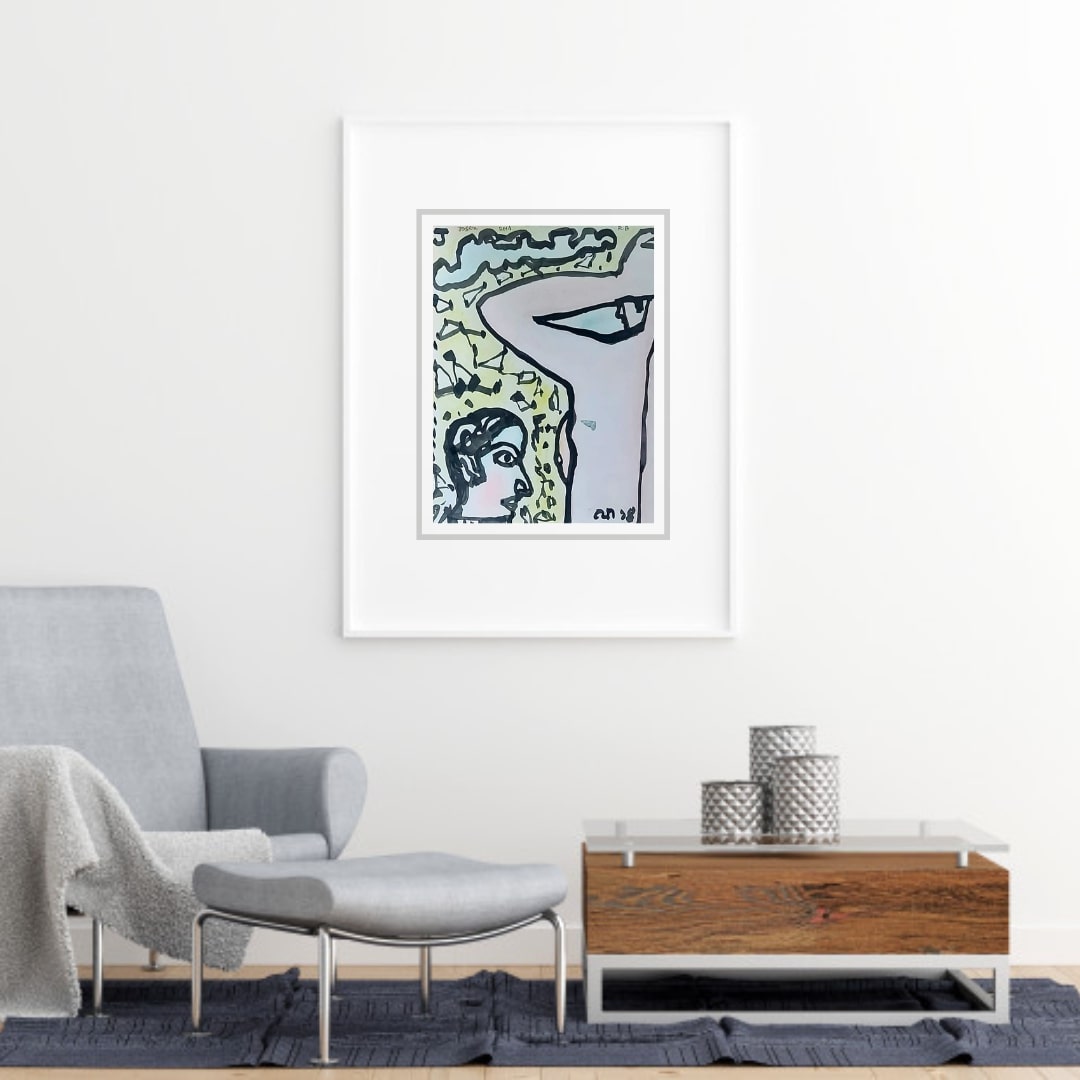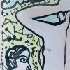 This painting, created by Jogen Chowdhury in 2014, is a striking example of his signature style that blends figurative expression with abstract and symbolic forms. Executed in ink with brush and dry pastel on paper, the artwork portrays a stylized human face juxtaposed with an abstract form, possibly an arm or torso, rendered in bold, flowing black lines. The background features fragmented geometric motifs and dynamic strokes, adding a rhythmic and almost musical quality to the composition. Chowdhury’s controlled yet spontaneous linework captures both structure and emotion, giving life to his figures through minimal yet expressive details. The use of subdued pastel tones contrasts beautifully with the dark outlines, enhancing the sense of depth and intimacy. The painting reflects the artist’s ongoing exploration of human emotion, identity, and the subtle tensions that exist between the physical and psychological realms.