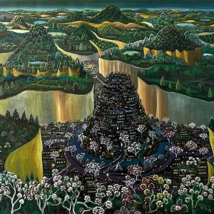 This beautiful painting by Shuvaprasanna Bhattacharya exudes a sense of delicate harmony between life and stillness. Set against a warm ochre background, the composition juxtaposes a deep, earthy vase with a vibrant, blooming flower, their organic forms connected by curling green tendrils. The flower, rendered in soft yellows and pinks, radiates vitality and grace, while the dark vessel beside it suggests stability and containment. The textural surface and subtle interplay of light and shadow enhance the tactile quality of the work, giving it both depth and warmth. Through this poetic dialogue between the vessel and the flower, the artist explores themes of creation, continuity, and the fragile beauty of existence. The painting’s simplicity is enriched by its emotional resonance, capturing a timeless moment where nature and form meet in perfect visual rhythm.