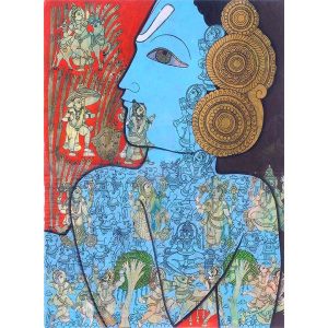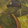This painting by Jamini Roy depicts a Santhal woman, reflecting his deep admiration for the tribal communities of Bengal and their simple, harmonious way of life. Executed in tempera on board, the artwork captures the woman in a graceful, introspective pose, with her arm lifted to adjust her hair and her head gently tilted downward. The green-toned figure, adorned with a flower in her hair and clothed in a flowing ochre drape, stands against a textured background of earthy yellows and greens, evoking the vibrancy of rural landscapes. Roy’s bold outlines, simplified forms, and luminous palette combine to highlight both strength and elegance, embodying the dignity and vitality of Santhal women. This painting beautifully reflects his departure from Western academic realism toward a uniquely Indian modernist idiom rooted in indigenous traditions.