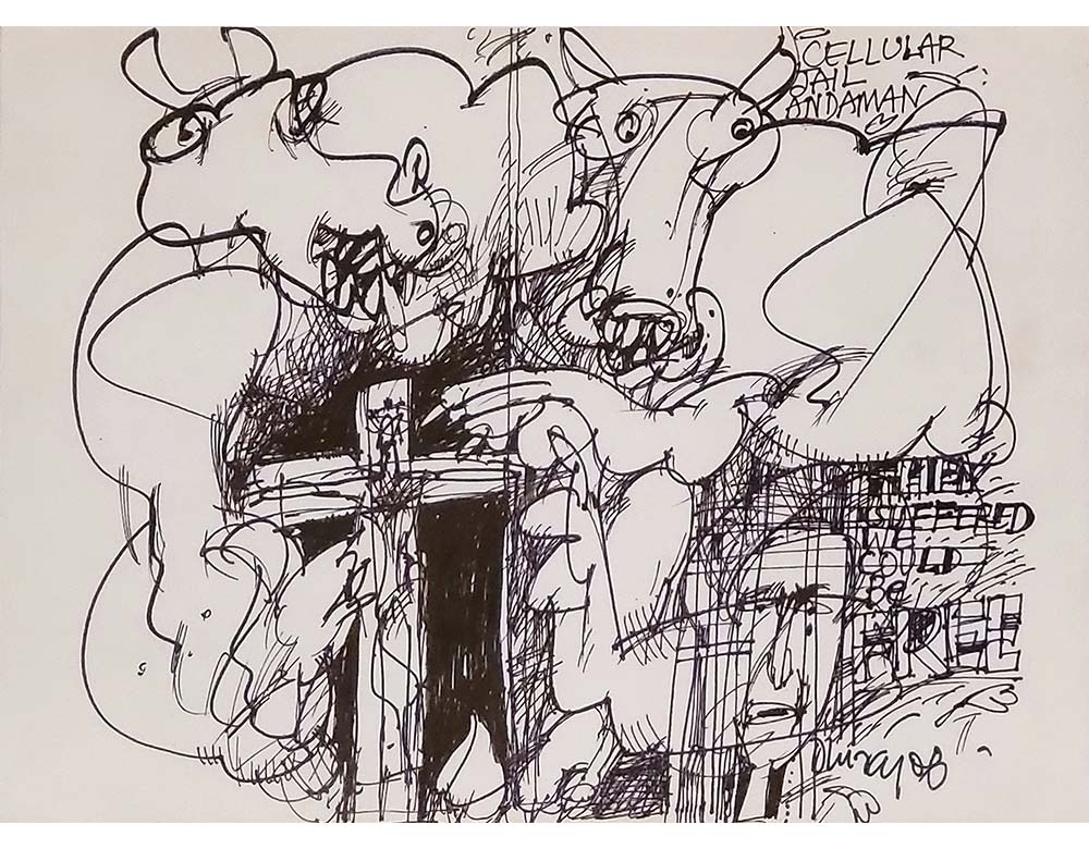Initially in the 1960s, Choudhary made the condition of the downtrodden and displaced the focus of his work. Whether it is the famine-stricken peasants of Bengal crying out for some food, the miserable farmers of the South gathering the harvest in other`s fields, a murdered agitator lying on a Mumbai street, drifters or prostitutes, Dhiraj lends them an extremely ironical air. They are all the allegedly free citizens of a country that was supposed to awake to freedom but didn`t. Some of his pen and ink drawings from the 70`s and 80`s are absolutely frightening, reflecting his own intense reaction to witnessing the horrors of Indian society. There are beggars fighting with animals on the road over scraps of food. There are scenes of a feast, where the affluent are dicing and popping morsels of the poor into their insatiable mouths. This metamorphosed into his disenchantment fuelled Banalata series of the 90`s, where Choudhary painted the character from Jibananda Das` famous poem, `Banalata Sen of Nattore.`