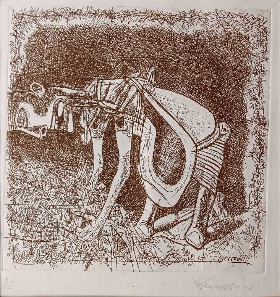 Born in 1937 in Kolkata, Ganesh Pyne studied at the Government College of Art and Craft, Kolkata. The foremost exponent of the Bengal School of Art, Pyne has blended romanticism, fantasy and an inventive play of light and dark, within the labyrinths of the subconscious, in his works. His signature style was shaped from his own experiences of solitude, alienation, pain and horror as well as moods of tenderness and serenity that sometimes arose in his work.