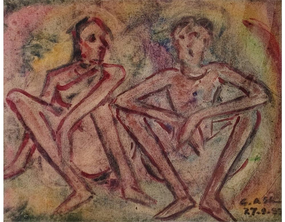 A prolific yet reclusive artist, Ash worked in a variety of mediums, including watercolour, tempera, acrylic, and oil; he was also a fine draughtsman. Starting out with landscapes and portraits, Ash evolved as an artist by experimenting with naturalistic and socio-realistic themes, and abstract expressionism. Common people toiling hard to earn their livelihood were frequent subjects in Ash’s earlier works. One of his most acclaimed series was on the ravages of the 1943 Bengal famine that killed millions of people; a documentary film on the artist and his famine series was commissioned by the Government of India in 1985.