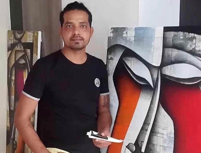He is known for his charcoals on paper or canvas. His works bring out the drama of black and white by introducing solid blocks of paint, which are restricted to reds, yellows and orange. The contrast sets the mood of the work, highlighting the characters that he paints. The varied nuances of male and female relationship are manifested in his paintings through the medium of charcoals and colors on paper and canvas. He uses colours to depict relationships in different moods and emotions.
